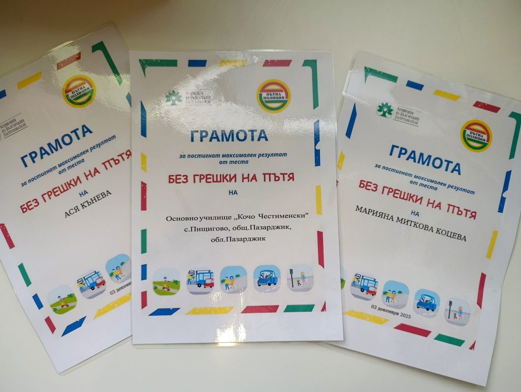 С гордост споделяме, че учениците от ОУ ,, Кочо Честименски ” с.Пищигoво се включиха в националния тест за пътна безопасност „Без грешки на пътя“ и го решиха без грешка, като показаха отлични знания, внимание и отговорно отношение към правилата за движение по пътищата. Поздравления за Ася Кънева и Марияна Коцева, които се явиха самостоятелно и…